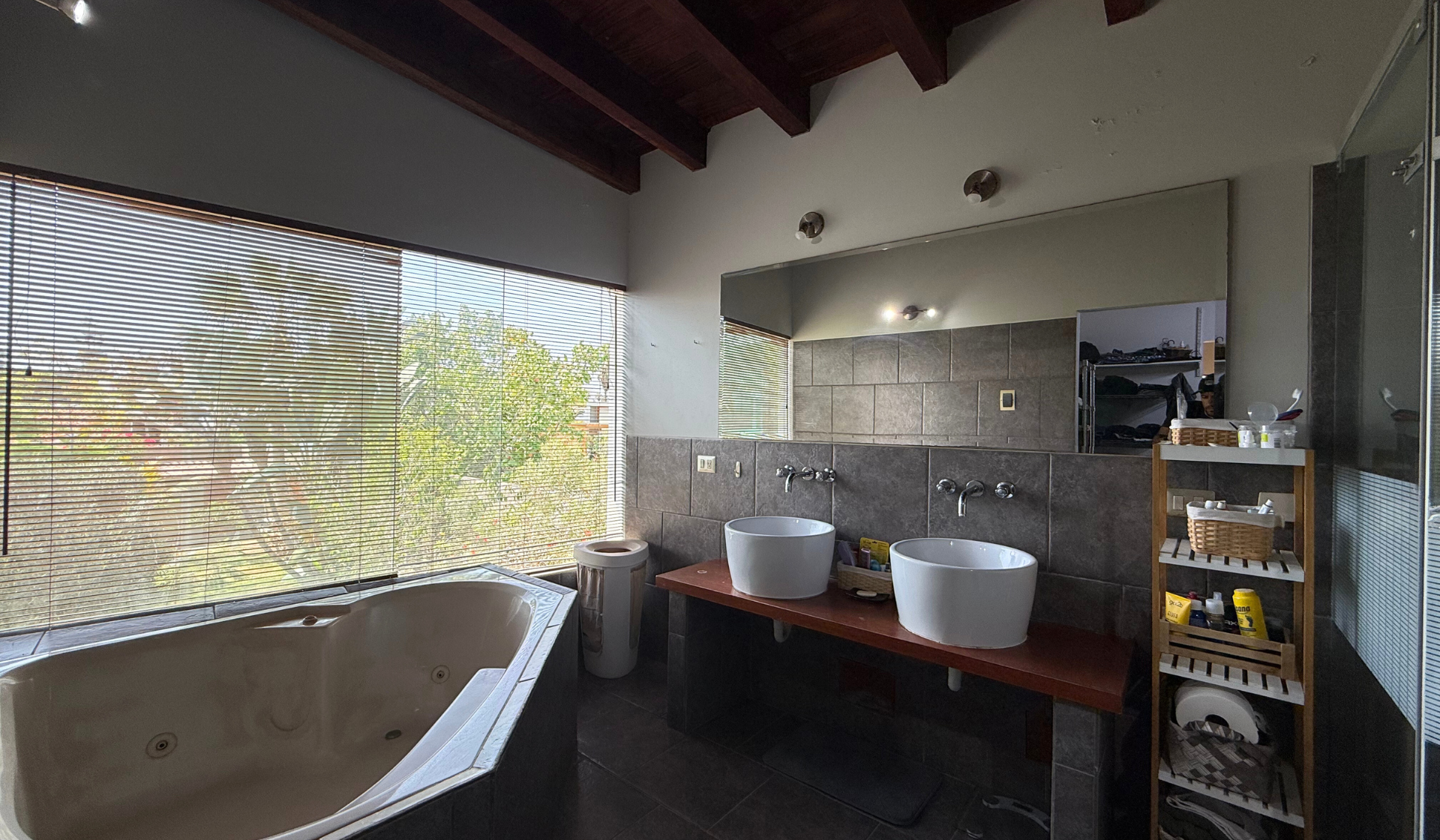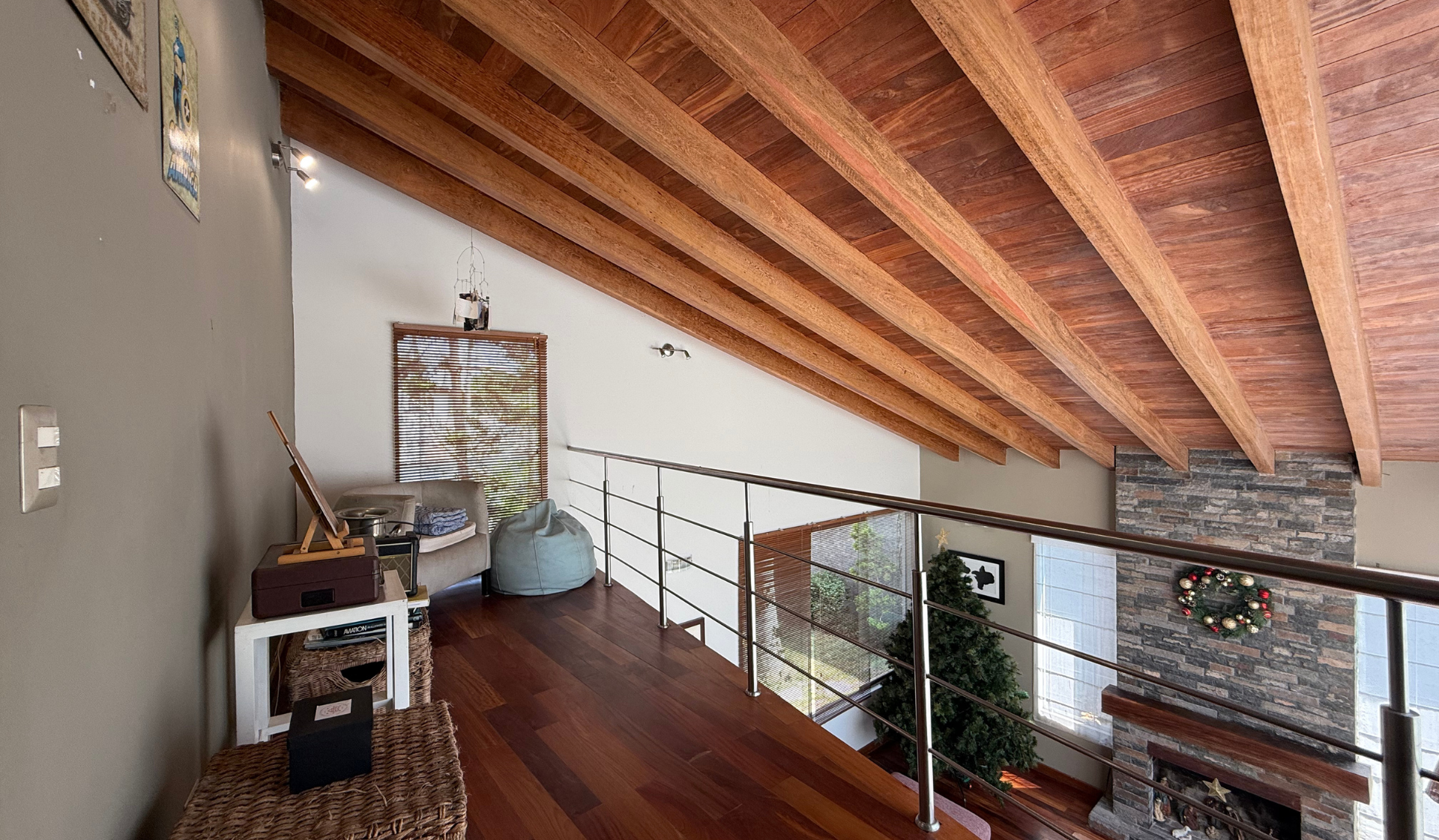 – Dormitorio Principal amplio con vista al jardín, cuenta con chimenea, techos altos de madera, walk-in closet, baño con jacuzzi, ducha y doble lavamanos