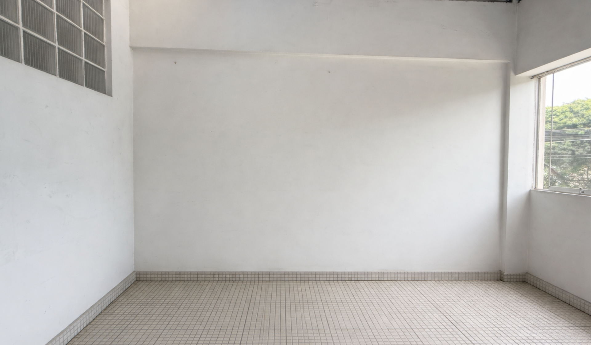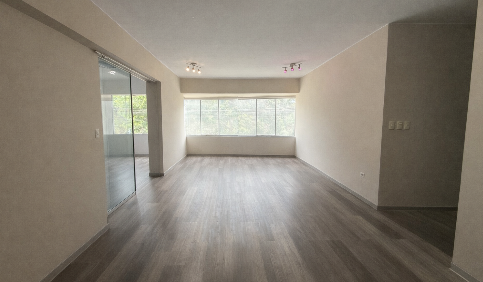Al ingresar al departamento nos recibe una sala y comedor de buen tamaño, con excelente iluminación natural. Hacia la izquierda se encuentra una terraza techada con piso cerámico en mosaico pequeño, muros blancos y estructura con cobertura translúcida azul, que permite el ingreso de luz y ventilación.